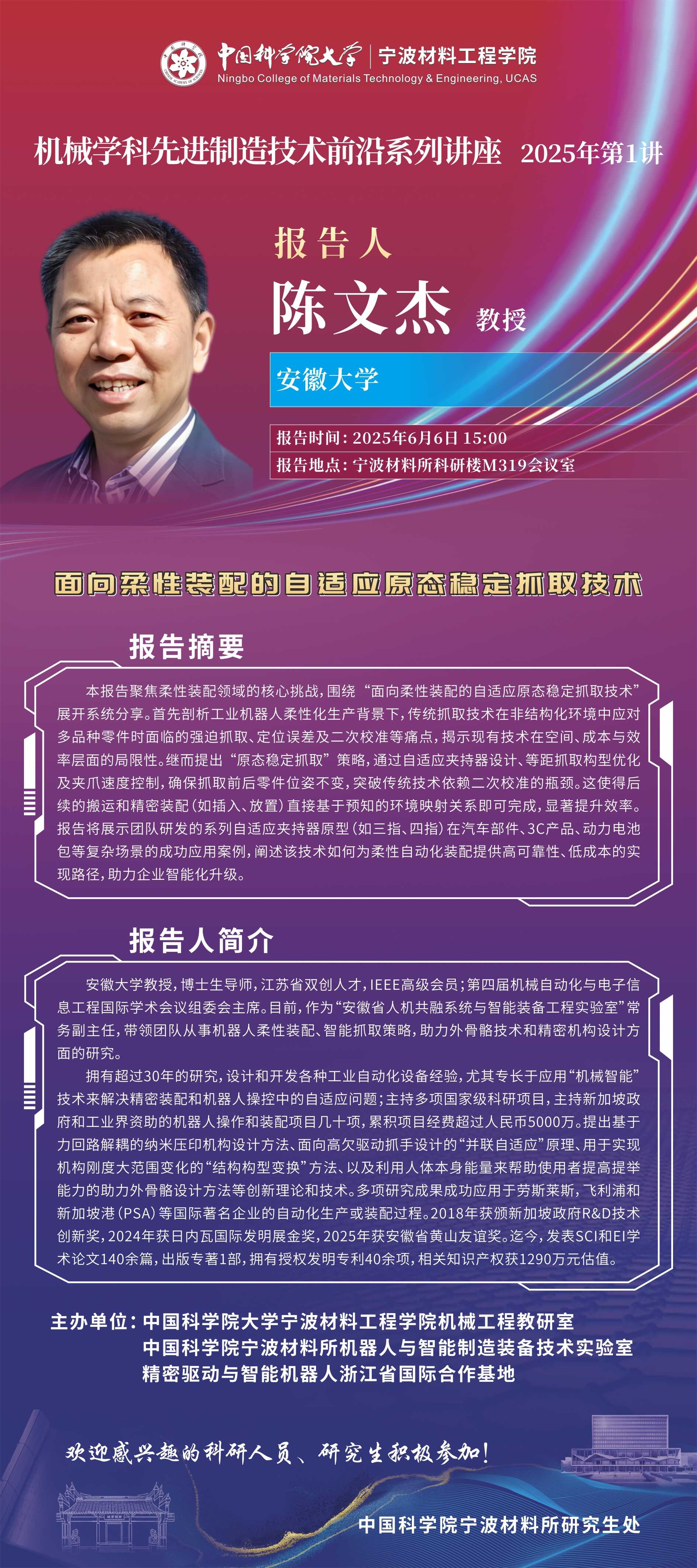 6月6日:陈文杰:面向柔性装配的自适应原态稳定抓取技术