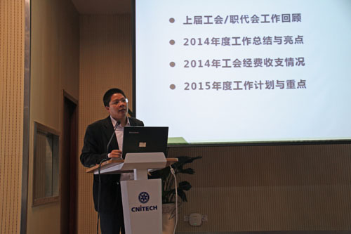 工会主席刘兆平做了工会工作报告,他详细报告了2014年工会工作,分析了面临的形势,部署2015年工会工作,动员广大职工代表为材料所的发展献计献策。