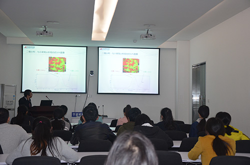 在报告中,龚沿东从Kratos公司XPS仪器的五大核心技术—高功率、大罗兰圆的单色X射线源、浸入式磁透镜、大半径双层能量分析器、二维阵列延迟线检测器和无阴影荷电中和器入手,讲述了快照谱超高速深度剖析方法及优势,以及审稿中数据谱图问题。结合科研工作,龚沿东还重点讲解了XPS在科研工作中的应用案例,比如化学状态分析、成像分析、辨分析、深度剖析等。他还讲到XPS测试中,最重要的是数据质量的控制,包括荷电的均匀性、本底的扣除和线型的选择、自旋-轨道耦合劈裂金属的单质和氧化态的区分、相同能级峰宽的比较等。龚沿东的报告深入浅出,与科研工作结合紧密,引起了众多科研人员的兴趣。报告结束后,与会人员针对仪器原理和数据判断等问题与龚沿东进行了深入讨论,现场互动交流气氛热烈。