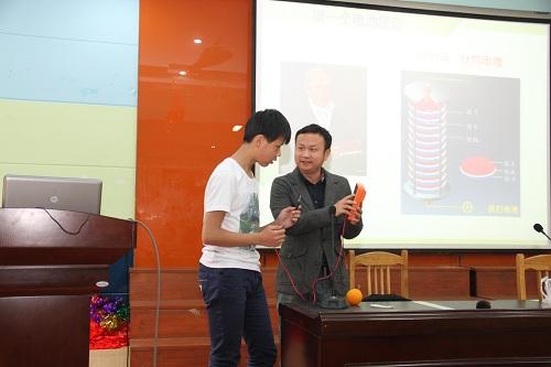 汪伟从日常生活中常见的电池说起,介绍了现代电池的起源、原理及应用。在说明电池原理的时候,他拿出了两个橙子,让在场的同学操作银丝和铜丝通过橙子这一导体连接产生电压的实验。激发了在场同学们浓厚的兴趣,活跃了现场气氛。为了让同学们有更深刻的理解,他展示了锂电池内部的物质,由此引出锂离子电池的组成。同学们通过亲手触摸锂离子电池内部的导电条带,将抽象的化学方程式具象化到实物,颇有收获。讲座的最后,汪伟呼吁在场的同学们不要随便丢弃报废电池,号召他们通过合理的回收利用,降低污染,节约能源,保护环境。