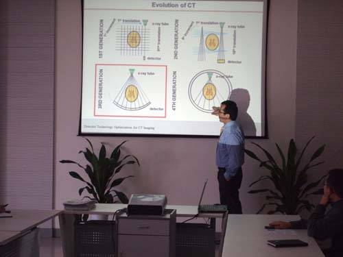 Aziz Ikhlef简要介绍了从事CT探测器研发10多年来的工作情况,以及近几年来探测器技术的发展历程以及探测器系统的结构组成,并对探测效率的影响因素以及探测系统的核心器件——闪烁陶瓷材料的闪烁性能进行了深入探讨和广泛交流。Aziz Ikhlef博士还介绍了目前世界上应用于医疗CT探测器的三大闪烁陶瓷材料(HiLight、GOS、Gemstone)的主要性能以及未来应用于医疗CT探测器闪烁材料的发展趋势。