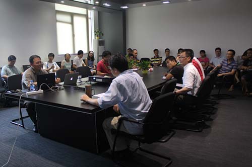 王德利分析了全球能源、环境危机及其应对措施,之后结合其研究领域介绍了三维枝状半导体纳米结构在能量的捕获、转化和存储方面的应用,并详细介绍了这种结构在高效太阳能燃料方面应用的独特优势。王德利详细分析了太阳能燃料生产的基本原理,指出了材料界面现象分析的重要意义。会上,王德利着重介绍了纳米线在高灵敏度光探测器方面的应用,利用纳米线阵列与视网膜表面微结构的相似之处,指出了纳米线阵列在人造仿生眼等人机界面方面的应用前景。会后,王德利与参加交流的科研人员和研究生就相关学术和技术问题进行了交流和讨论。