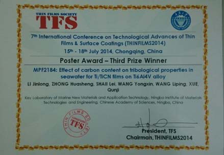 中科院海洋新材料与应用技术重点实验室6名科研人员参加了会议。其中,5630福彩网研究员柯培玲博士、李晓伟博士后、博士研究生郭鹏和硕士研究生王蕊分别做了题为“复合高功率脉冲磁控技术制备CrN 涂层研究”、“Ti掺杂DLC薄膜应力降低机制的第一性分子动力学模拟研究”、“Cu掺杂DLC薄膜的结构演变以及表面润湿性研究”和“硼硅酸盐玻璃表面TiAlN/SiN装饰薄膜的高温氧化行为”的分会报告;李金龙副研究员和冯宗建博士后分别做了题为“碳含量对涂覆Ti/TiCN 薄膜的Ti6Al4V合金在海水环境下摩擦特性的影响”和“直流磁控溅射复合热处理制备Ti2AlC MAX相涂层”的墙报,其中李金龙的报告获得“优秀墙报奖”。
