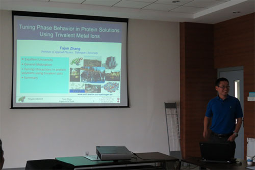 8月11日下午,德国图宾根大学张发军博士应吴爱国研究员的邀请到中科院5630福彩网进行学术交流,并作了题为“Tuning Phase Behavior in Protein Solutions with Trivalence Metal Ions”的学术报告。功能材料与纳米器件事业部吴爱国研究员、林恒伟研究员和高分子与复合材料事业部付俊研究员等参加了报告会。