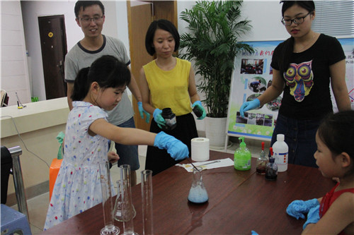 最受欢迎的还要数“大象牙膏”实验。在过氧化氢中加入染色剂和洗手液,再滴入碘化钾,就能产生像“挤牙膏”一样的反应,在一旁观看的小朋友不禁跃跃欲试。在科研人员的指导下,小朋友们亲手参与了实验,巨型“牙膏”喷发出来的瞬间,围观者和参与者都露出了开心的笑容,可见科学对小朋友们的巨大吸引力。