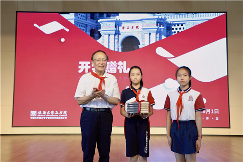 随后,薛群基院士作为中国科学院大学宁波材料工程学院附属小学名誉校长发表讲话。他回忆了自己70年前的小学生活,表示作为“生在旧社会,长在红旗下”的一代人,他非常羡慕同学们现在能够拥有美丽的校园、优秀的老师和丰富的活动,并对同学们提出了殷切的希望,希望大家能够珍惜良好的学习条件,热爱自然、充满好奇、对新事物要有兴趣,多看书、多提问,多向老师请教、多与同学讨论;上课要集中注意力,做事要有条理,坚持钻研,一定会有所收获。薛群基院士还向同学们赠送了开学礼,同学们回赠了专门为薛群基院士创作的画作。