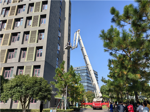 随着一阵警报声响起,安全员迅速到位指导大家手捂口鼻,弯腰迅速、有序、按照逃生路线撤离到指定区域集合,各科研团队清点人数并逐级汇报,整个疏散演练过程严谨有序。演练还模拟了人员被困,消防队使用担架和消防登高车实施救援的情况。