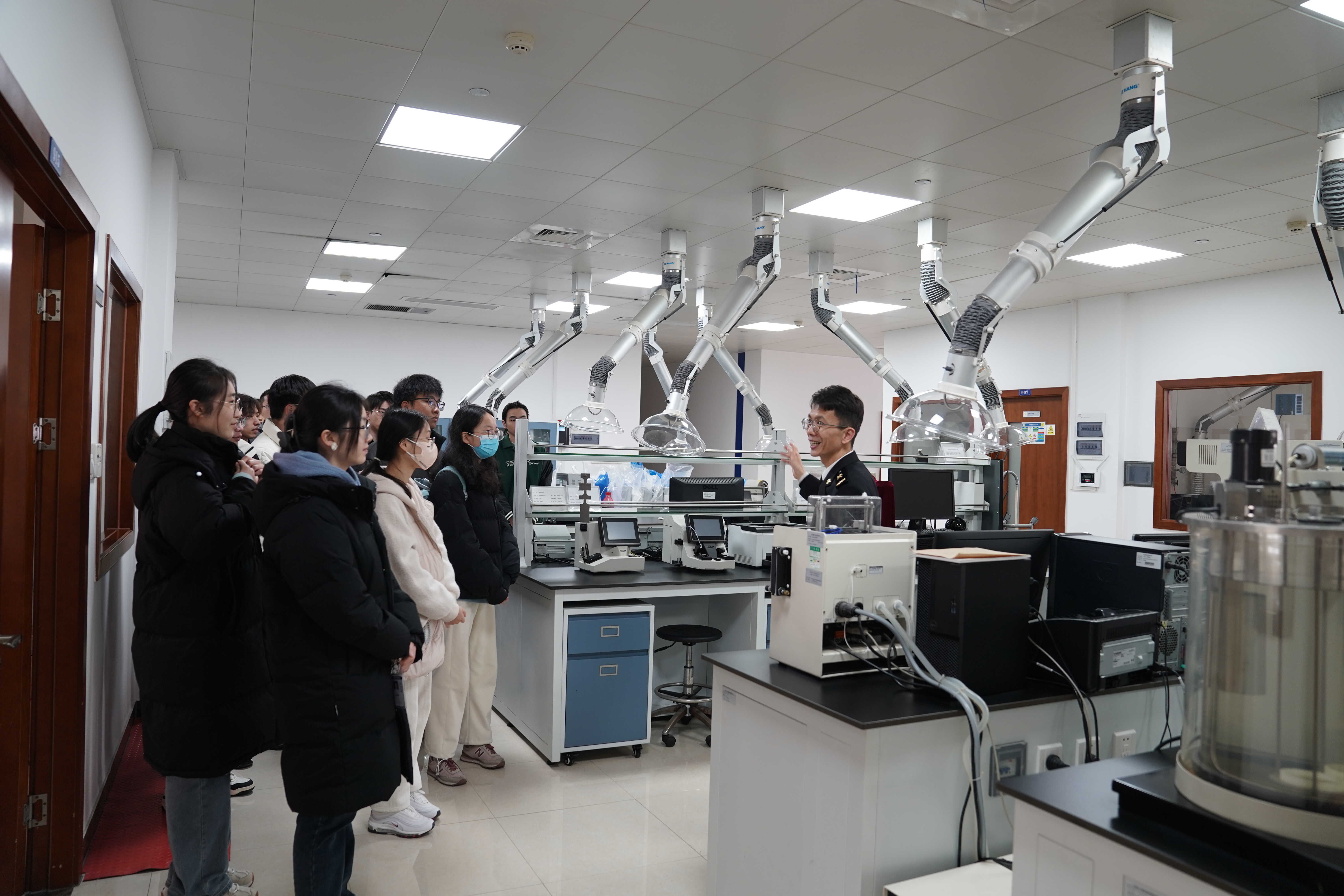 座谈会后,同学们先后参观了宁波海关技术中心石油化工、化妆品高分子、辐射检测实验室,充分了解了中心的仪器设备、质量控制、检验检测能力等情况。