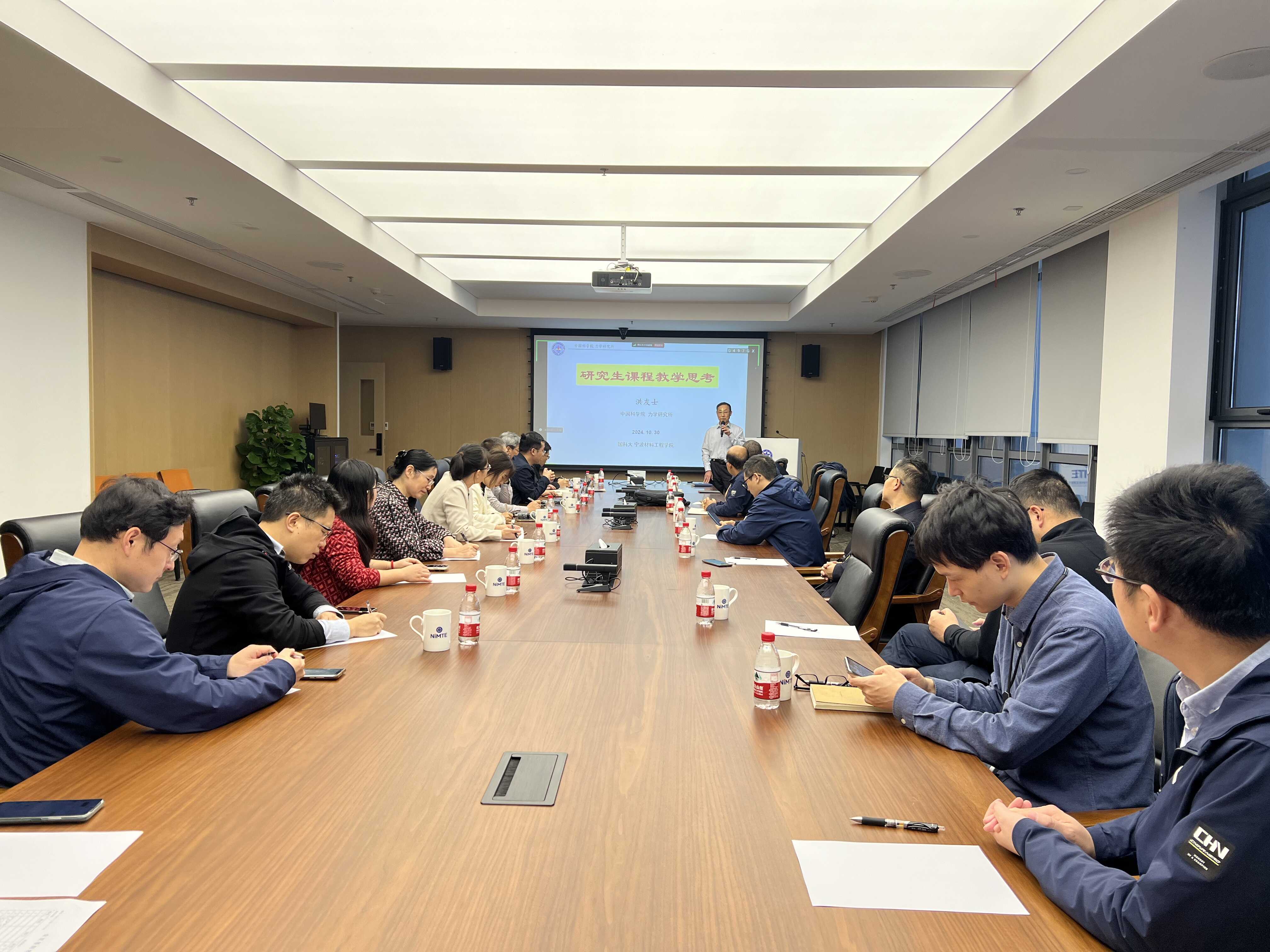 10月30日,中国科学院大学教学督导委员会副主任、原中国科学院力学研究所所长、亚太材料科学院院士洪友士来访国科大宁波材料工程学院,并作了题为“研究生课程教学思考”的报告,30余名教师听取了报告。