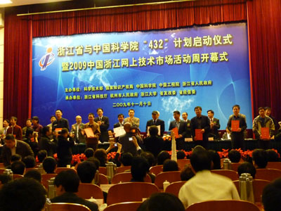 2009年11月10日,浙江省与中国科学院‘432’计划启动仪式暨2009中国浙江网上技术市场活动周开幕式在杭州顺利开幕。启动仪式上宁波工研院与企业签订合作意向4项,派出科技特派员25人,接收科技派员7人,针对项目和特派员浙江省科技厅将予以重点支持。会上浙江省领导为100多位首批科技特派员颁发了聘书,我院转移办谢开锋代表全体特派员做了表态发言。 副省长金德水,浙江省科技厅厅长蒋泰维、中科院院地合作局局长戚强出席开幕式。