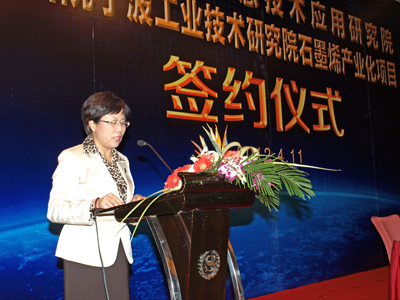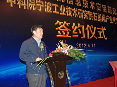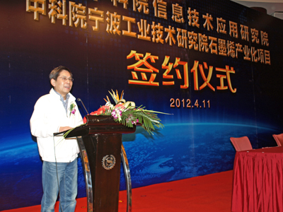 4月11日,中科院宁波材料技术与工程研究所(宁波工业技术研究院)石墨烯产业化项目签约仪式在东港喜来登大酒店隆重举行。中科院副院长施尔畏,宁波市委副书记、市长刘奇出席仪式并致辞。宁波市政府副秘书长陈炳荣主持签约仪式。