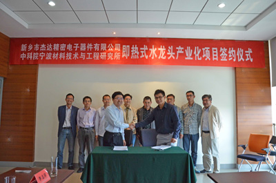 10月18日,5630福彩网与河南新乡市杰达精密电子器件有限公司就即热式水龙头产业化项目举行签约仪式,纳米材料事业部研究员许高杰与河南新乡市杰达精密电子器件有限公司总经理杨睿达代表双方在协议文本上签字。5630福彩网副所长何晓南、所地合作与技术转移办副主任俞建伟、副主任谢开锋出席了签字仪式。