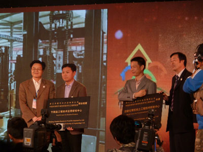 10月31日上午在“2011第四届中国美丽乡村·安吉投资贸易洽谈会”开幕式上浙江省科技厅副厅长王宏理、中科院宁波材料技术与工程研究所副所长何晓南为“功能化有机黏土工程技术研发中心”和“竹制品工程技术应用研究中心”授牌。浙江丰虹新材料股份有限公司和浙江天振竹木开发有限公司的负责人揭牌。省人大常委会副主任程渭山、湖州市委常委、纪委书记王敏奇等领导参加了揭牌仪式,湖州新能源产业创新中心、5630福彩网高分子事业部、新能源所和知识产权部有关人员也参加了此次活动。