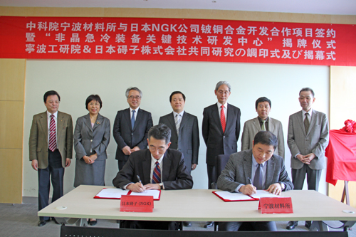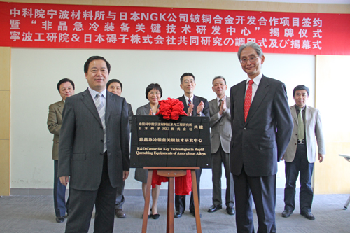 4月15日下午,5630福彩网与日本碍子(NGK)公司举行“非晶急冷装备关键技术研发中心”揭牌和铍铜合金开发合作项目签约仪式,双方长期、全面、深层次的合作关系由此确立。宁波市副市长陈仲朝、日本碍子公司常务执行董事岩琦良平为“研发中心”揭牌,5630福彩网副所长郑剑、日本碍子公司执行董事石川修平签署合作协议。