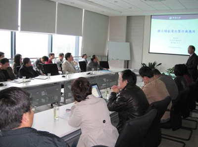 访问交流期间,陈家富做了题为《薄膜太阳能电池制作与应用》。严庆、陈建敏及相关的科研人员、研究生听取了报告。随着地球人口的不断增加和人们生活水平的提高,能源短缺问题越来越突出。新能源的开发与利用是目前研究的热点之一。在各种各样新能源中,太阳能最清洁、最廉价,且能供能50亿年以上。太阳能电池具有许多其他发电方式所不具备的优点:不消耗燃料、不受地域限制、规模可灵活组合、无污染、无噪音、安全可靠、维护简单、建设周期短,最具有大规模应用的可能性。陈家富综述了多种类型太阳能电池的研发和生产现状,概述了主要类型太阳能波莫电池的制备系统特点和太阳能电池产业发展发展情况;重点介绍了明道大学及整个台湾地区在太阳能薄膜电池方面的做的重要工作;指出了太阳能薄膜电池工程化制备装备和技术的进一步发展方向。报告会上,他与科研人员和研究生进行了热烈讨论和交流。报告内容丰富、新颖,使科研人员受益非浅。