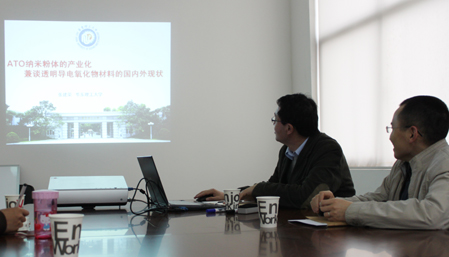 张建荣博士结合其课题组的研究方向,为大家作了一场题为《ATO纳米粉体的产业化兼谈透明导电氧化物材料的国内外现状》的精彩学术报告。详细讲述了隔热材料、ATO纳米粉体及靶材制备工艺;重点讲述了ATO纳米粉体的优势、存在问题;生动描绘了ATO产业化趋势等。张建荣博士还与许高杰研究员以及事业部其他师生进行了互动交流,逐一解答了大家感兴趣的问题并进行了深入探讨,取得了积极效果。双方表示应进一步加强沟通,希望在现有基础上开展更具体和实质性的合作。报告会结束后,张建荣博士在蒋俊研究员的陪同下,参观了纳米事业部相关实验室以及公共测试平台。
