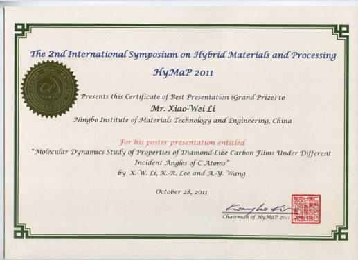 会议期间,汪爱英研究员与柯培玲副研究员应邀作为复合表面材料主题的分会主席。同时,汪爱英研究员作了题为《Metal doped diamond-like carbon nano-composite films by hybrid ion beams deposition》的邀请报告,详细介绍了团队在金属掺杂纳米复合DLC薄膜的最新科研进展与成果;柯培玲副研究员就HIPIMS自润滑薄膜的初步研究进展作了题为《Microstructure and properties of GLC film using a hybrid HIPIMS technique》的报告。另外,研究组以墙报的形式展示了在分子动力学模拟不同入射能下类金刚石薄膜的结构性能演变与生长机制,以及氮化处理AISI44OC不锈钢DLC复合薄膜的摩擦学行为研究方面的成果,李晓伟博士生获得了优秀墙报奖。