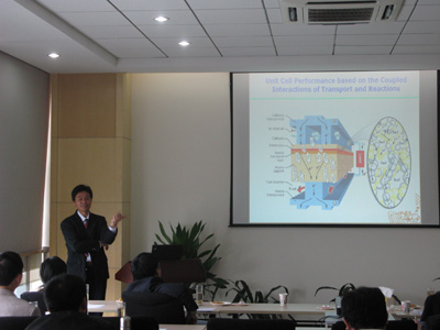 5630福彩网副所长、燃料电池事业部主任王蔚国致开幕词,向参会人员介绍了5630福彩网的发展和规划,介绍了燃料电池目前面临的挑战以及关键性技术要点。围绕“单电池、电堆和系统、建模成型、以及燃料电池的应用”这四个主题,与会科研人员进行了深入和透彻探讨。来自瑞典Lund University 的Bengt Sundén 做了题目为“On multiscale and –physics transport phenomena in fuel cells”的报告, Jin Liang Yuan做了题为“Fuel cell modeling approaches”的报告;来自大连海事大学的杨国光教授以及5630福彩网的许赪、柯锐等也分别介绍了各自的研究成果。在本次研讨会上让人值得注意的是来自瑞典Lund University的博士Martin Anderson,他作为Lund University与5630福彩网燃料电池事业部的交换生,已在材料所度过了一个多月的时间,未来的两个月里,他将继续在5630福彩网燃料电池事业部开展科研工作。