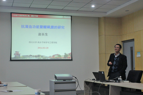 赵长生作了题为“抗凝血功能聚醚砜膜的研究”的学术报告。详细介绍了其课题组在制备抗凝血聚醚砜(PES)血液透析中空纤维膜及其改性过程的研究,系统阐明了各类生物活性改性基团对血液透析膜影响的机理及抗凝血,抗污染效果等方面的研究结果。