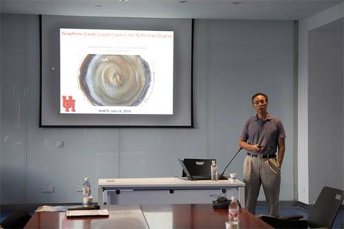 包教授围绕其课题组最新的进展,作了题为“Graphene Oxide Liquid Crystal for Reflective Display”的学术报告。他首先简单介绍了课题组最近的三个科研工作,包括利用纳米CoO高效太阳能分解水、扭转双层石墨烯的拉曼表征以及用作规模化生物医学传感器的银染纳米孔阵列。随后包教授重点介绍了氧化石墨烯的液晶特性,并且展示了如何利用二维材料的液晶相来实现反射式显示,反射式显示器的最大优势就是不需要偏振片和背光照明。通过简单的划动就可以在氧化石墨烯溶液表面写出字母,包教授展示的几张照片更是引起了大家极大地兴趣。同时包教授还深入研究了氧化石墨烯的浓度对最终显示结果的稳定性和持久性的影响,并且给出了合理的解释。