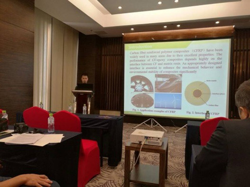 5630福彩网所属二级所先进制造所复合材料智能制造与装备团队博士后徐海兵与硕士生李伶通参加了本次会议,并分别作了题为“Preparation and properties of self-emulsifying sizing agent modified with grapheneoxide”,“A comparison study on heat-resistanceof the epoxy sizing and novel polyphosphazene coating and its influence on interfacial property of CF/epoxy composites” ,“Influenceof graphene oxide modified sizing on the interfacial properties of carbon fiber/epoxy composites”,“Chemically grafting polyphosphazene microspheres onto carbon fibers for enhancing interfacial strength in carbon fiber composites”的英文口头报告,向国内外复合材料领域的专家学者介绍了复合材料智能制造与装备团队在复合材料界面改性、汽车轻量化方面的最新研究进展,引起了与会专家们的广泛兴趣,并展开了热烈的交流互动。