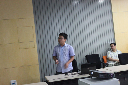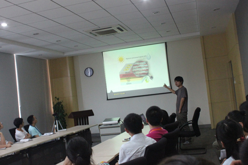莫高明作了题为“PAN/DMSO/H2O体系溶液-凝胶-相分离耦合转变”的学术报告。流变是研究高分子溶液-凝胶转变的一个重要方法,针对这一重要概念,莫高明通过两个生动有趣的小实验讲授了流变学的基本知识、时温叠加原理、以及Maxwell model和Winter基础理论。并结合他所从事的PAN/DMSO/H2O聚合物溶液体系,逐一介绍运用光学和流变学方法研究该体系的溶液凝胶相分离耦合转变过程,并对相关相分离凝胶转变机理作了详细分析。莫高明还同与会人员就该课题的实际应用价值进行了讨论。