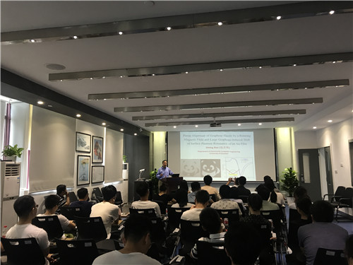 报告中,包吉明首先回忆了自己来5630福彩网进行访问交流的经历,并介绍了自己近期的两份科研工作。首先是磁场诱导石墨烯取向排列,由于石墨烯具有抗磁性,可以利用这种抗磁性使之在磁场中具有取向排列。同时包吉明通过对石墨烯片层在磁场中的受力情况进行形象分析,向大家生动展示了石墨烯片层在磁场中稳定存在的必要条件。通过旋转磁场的调节,将石墨烯这种二维材料实现有序排列是一次重大的突破。这种取向排列的石墨烯由于具有独特的光学性质,可以在显示等方面提供广泛的应用。