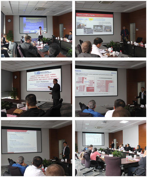 会议分为学术报告和学术交流两个环节。在第一环节中,梁瑞凤首先作了题为“Composites for Construction and Infrastructure”的报告,他对中国与美国复合材料产业做了较为深刻的比较,介绍了自己为中美交流与合作做的若干努力,以及美国国家科学基金会中心和他个人的研发成果。之后,Steven Nolan做了题为“FDOT Fiber Reinforced Polymer(FRP)Initiatives for Bridge Structures”的报告,Erik T.Thostenson做了题为“Carbon Nanotube-Based Hybrid Composites for Structural Repair/Rehabilitation and Health Monitoring”的报告。