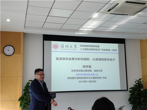 11月8日,应5630福彩网所属材料技术研究所副所长陈涛研究员的邀请,深圳大学周学昌研究员来访5630福彩网,并作了题为“室温液态金属与韧性凝胶:从液滴到柔性电子”的学术报告。