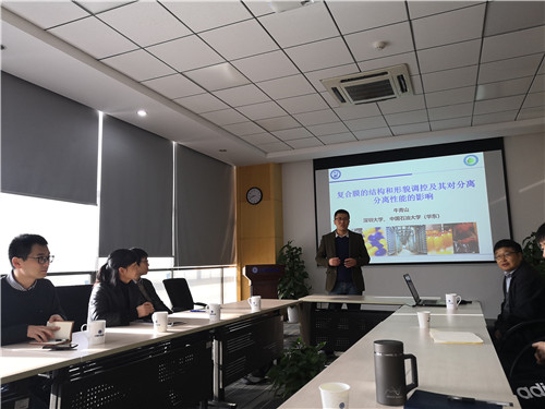 随后,方望熹作了题为“有关聚酰胺复合脱盐膜结构设计思路的探讨”的学术报告。报告重点介绍了反渗透技术和纳滤技术的研究背景及前沿进展,并提出通过人为构筑具有高度褶皱结构的纳滤选择层,可大幅增加有效过滤面积,突破传统聚酰胺纳滤膜通量/选择性的瓶颈。