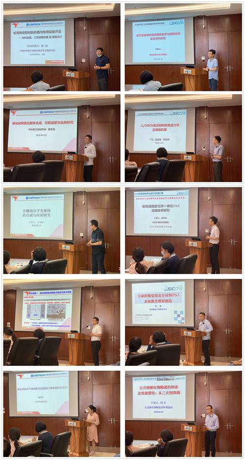 在学术交流报告阶段,结构陶瓷与复合材料工程研究中心的杨金山研究员、倪德伟研究员、梁汉琴副研究员、陈健副研究员和殷杰副研究员分别做了题为“基于低维纳米结构调控的多功能陶瓷基复合材料研究”、“Cf/SiBCN复合材料的高温力学及烧蚀机理”、“耐高温微波/红外一体化连接技术研究”、“大面积陶瓷基复合材料表面激光增材制造”和“立方相碳化物陶瓷的制备及性能研究:从二元到高熵”等5个学术报告。先进能源材料工程实验室的徐剑研究员、裴学良副研究员、宋育杰副研究员、周小兵副研究员和葛芳芳副研究员则做了题为“陶瓷复材的仿真与专用设备开发——材料仿真、工艺过程仿真及装备设计”、“碳化硅陶瓷先驱体的合成、交联成型与应用研究”、“含硼高分子先驱体的合成与应用研究”、“碳化硅陶瓷无缝连接技术研究”和“事故容错包壳管表面防护涂层”等5个学术报告。报告充分体现了先进陶瓷领域的学术前沿,并展现了青年科技党员勇于担当的学术风范,引起了大家热烈的讨论。两个党支部根据研究方向交互进行报告,互为启发,触发了大量深入合作的契机。