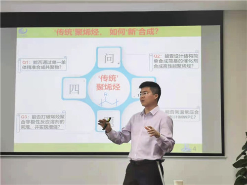 报告中,简忠保结合近年来在高性能聚烯烃材料制备方面的研究成果,详细介绍了具有自主知识产权的过渡金属催化剂的设计与合成,其中包括5个三碟烯或2个五碟烯/1个三碟烯匹配的全刚性立体受限的α-二亚胺钯催化剂,实现了以单一乙烯为原料在特定条件(温度/压力)下实现支化数目超高且可变的单一甲基支化类型的乙丙共聚物/嵌段聚烯烃的精准合成,和全温域、全压力段支化分布序列可控的共聚物精准合成;并介绍了首例C2-type、Cs-type型镍催化剂,这种新概念镍催化剂的包埋体积比其他催化剂高出5%以上,对中心金属形成上下方全方位保护,可实现超低支化(<0.1/1000C)超高分子量聚乙烯(>500万)的合成;随后又介绍了叠加双层大位阻、氟效应和纵横协同位阻的镍催化剂,常温常压下,在THF/Dioxane中可实现UHMWPE的制备。报告内容深入简出,生动精彩。与会人员围绕如何实现多嵌段共聚物的合成、如何验证预测的支化分布序列的准确性、如何实现聚烯烃的“可降解”等问题,与简忠保进行了热烈讨论和互动交流。