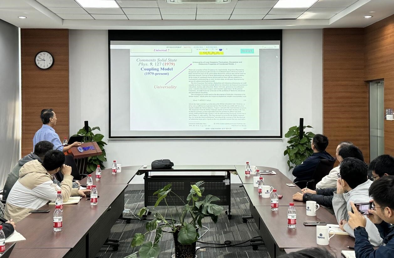报告从离子液体、胶体、金属玻璃等相互作用系统中普遍存在的弛豫和扩散问题为切入点,介绍了弛豫扩散中普适的Coupling Model耦合模型。Ngai Kia Ling创造性地将混沌的概念引入,通过将特征时间前后的指数方程与非指数方程连用,获得能够描述弛豫或者扩散发生转变的起始时间。通过不同体系中的中子散射等实验,结合介电谱与核磁谱等表征手段,在实验中证实了耦合模型的准确性,以及在水、药物、蛋白质、聚合物乃至金属玻璃中的普适性,并介绍了多体问题在复杂相互作用系统中的关键性。报告结束后,与会人员就弛豫、扩散、玻璃转变等问题进行了热烈的讨论和交流。