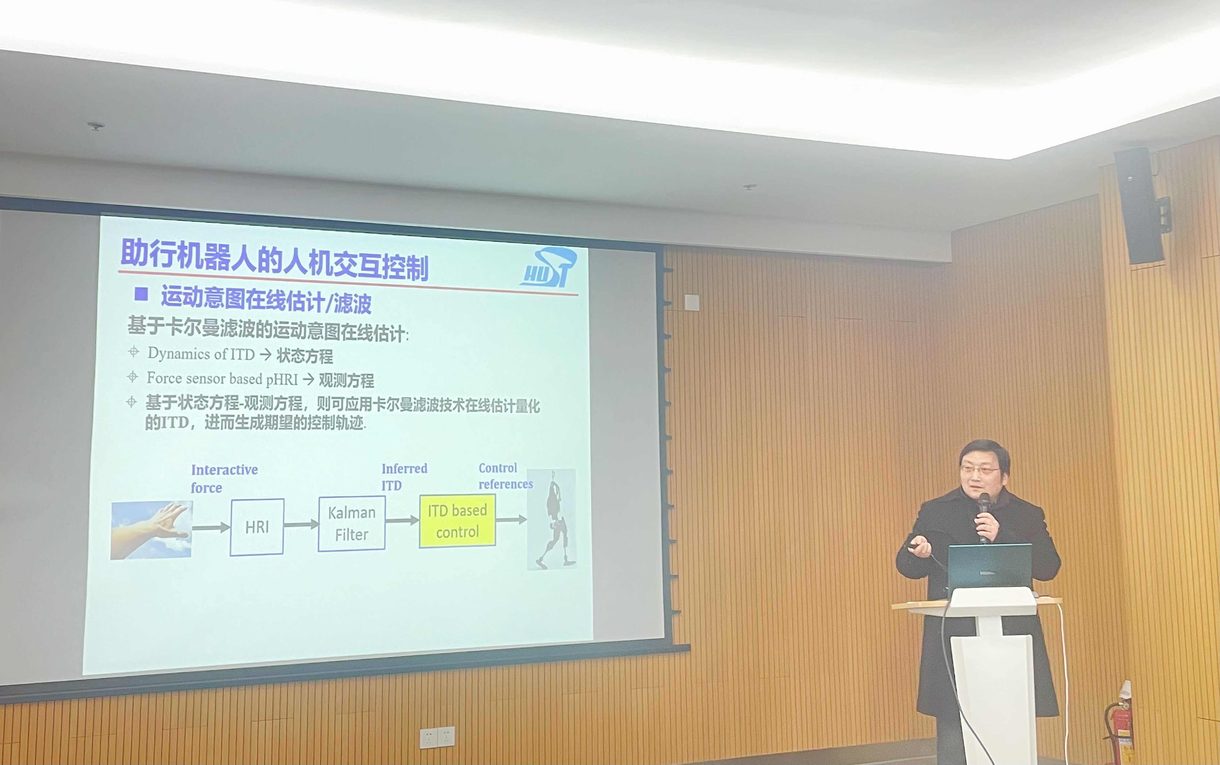 报告指出,智能助行机器人能够增强下肢功能障碍患者或老年人的步行功能,并定量评估其下肢运动功能。为了实现更好的人机交互,机器人需要理解用户的行走意图,黄剑团队提出了“意向性方向(ITD)”的概念,通过分析用户与机器人之间的交互力,建立了ITD模型来预测行走意图。在此基础上,开发了新的运动控制方法,使得助行机器人可以根据用户的意图调整运动特性,他还介绍了基于光学传感器技术的智能步态评估系统,可以精确检测步行事件并实时提取步态参数,有助于精准康复评估。报告最后,参会师生就助行机器人的关键技术与应用场景等问题进行了热烈讨论,大家受益良多。