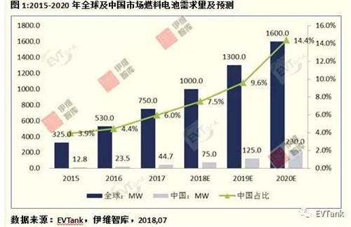 有机构预测测算,2020年中国市场燃料电池的需求量将达到230.0MW,占全球的市场的比重由2015年的3.9%上升到14.4%。届时,中国将成为全球主要的燃料电池生产和销售国。