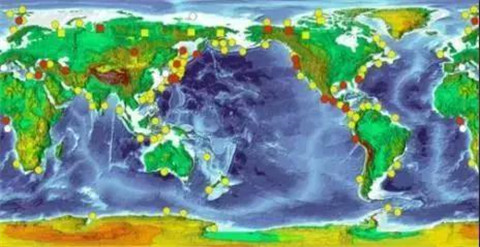 (可燃冰在世界范围内分布,红点为已探测到的,黄点为可能存在的位置)