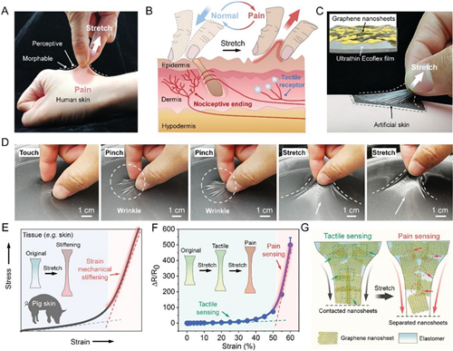 在ECF中,石墨烯片层之间相互堆叠形成的动态网络,可以通过不同程度的滑移,灵敏地响应外界应变刺激,从而实现低应变下正常的触觉感知,以及高于应变阈值的痛觉感知。