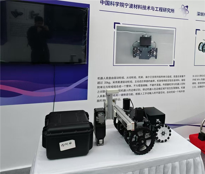 心里正犯嘀咕,其中一款机器人突然动起来,在垂直的钢板上,以不紧不慢的速度随意转向,游走自如。