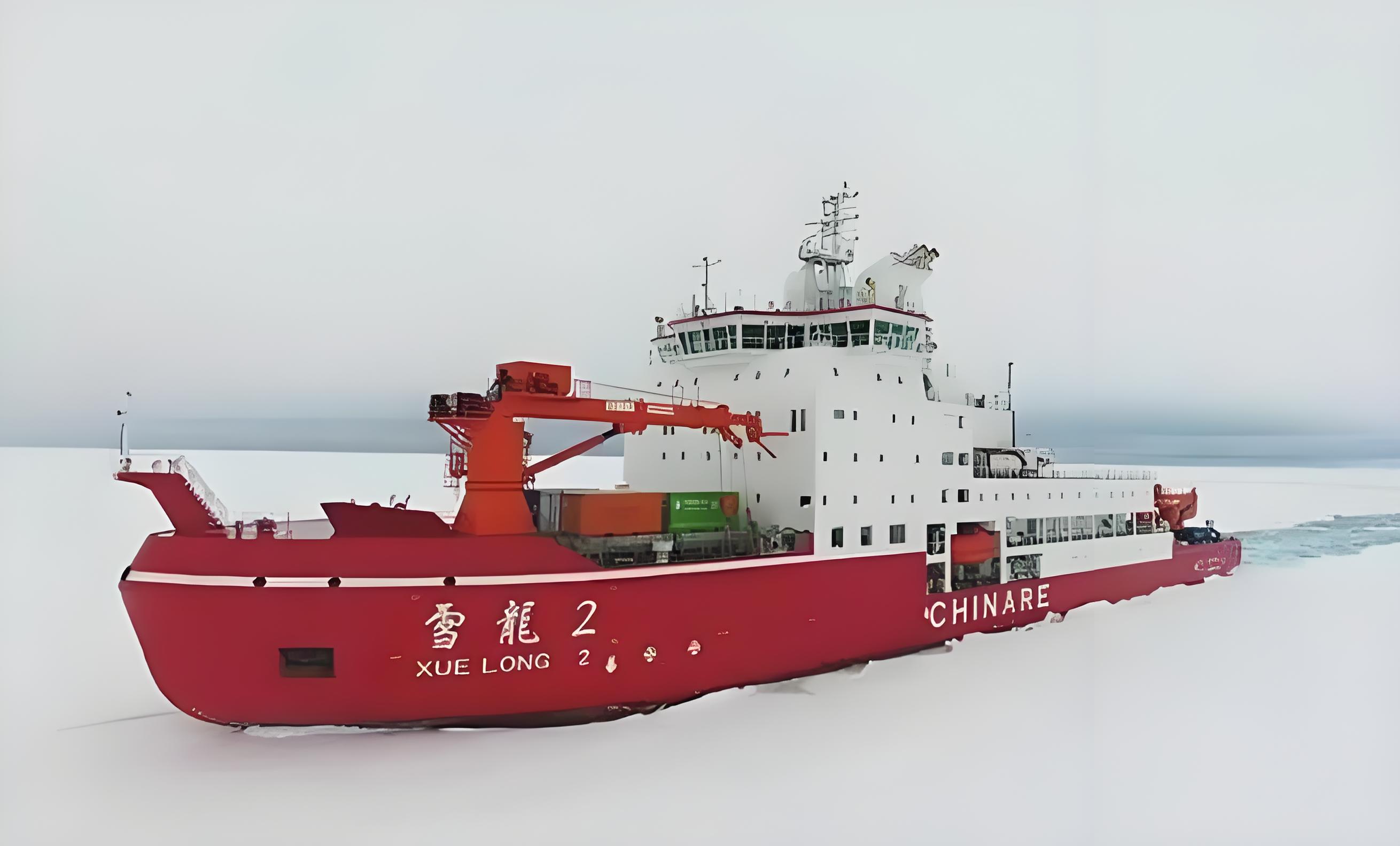 “雪龙2”号长122.5米,宽22.3米,是中国第一艘自主建造的极地科学考察破冰船,能破除1.5米高的冰层、0.2米厚的雪。