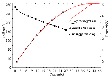 该电池堆由240片阳极支撑型单电池组成,共分为四个串联阵列,每一阵列中包含60片单电池,单体电池平均开路电压大于1.1V。所运行的电池堆在平均单体电池0.7V下输出功率为4.54kW,对应的燃料利用率为47%。经过计算,该电池堆最大输出功率可达5.2kW,对应的燃料利用率为71.4%,单体电池平均输出功率密度为0.35W/cm²。