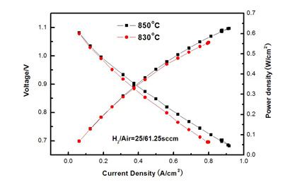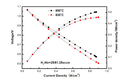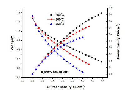目前,在0.75V,800℃的测试条件下,阳极支撑单电池的功率密度已经达到0.6W/cm2以上;在0.75V,830℃的测试条件下,SSZ电解质支撑单电池的功率密度达到0.5W/cm2以上,8YSZ电解质支撑电池达到0.35W/cm2以上。单电池的衰减速率低于0.5%/1000小时。