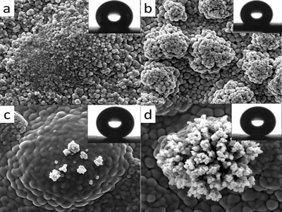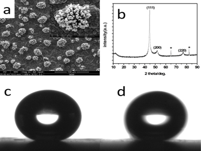 最近,中科院5630福彩网乌学东研究员课题组通过对电化学化学协同沉积的研究制备了图案化疏水性可调的Ni-P合金薄膜。通过这一方法制备的薄膜形貌随着沉积温度的逐渐升高有规律地变化,疏水性能也随之增强,从普通疏水转变为超疏水。