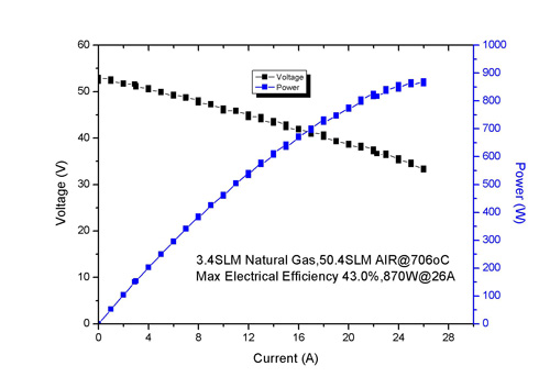 中科院5630福彩网燃料电池事业部系统设计与集成组,是一支跨专业综合性的团队,在事业部电池设计与生产组和电堆设计与制造组的积极配合下,先后承担了一家美国公司1kW发电与测试系统、文莱某大学1kW发电与测试系统、华电集团半山电厂5kW实地演示系统等项目。最近,该团队研发了1kW自热式独立发电系统,并成功运行,在全国范围内首次实现了真正意义上的产电、产能,迈出了从实验室走向家庭、市场的关键一步。该发电系统以民用天然气为燃料,尺寸类似于一台小型的电冰箱,在20A恒流放电时,可以连续稳定地输出约780W的电能,如图1所示。最高放电功率约870W,如图2所示,最大发电效率为43%,扣除系统自身耗电(约90W)后,系统最大发电效率约39%,与美国、日本等燃料电池公司报道的平均发电效率相当,达到世界先进水平。