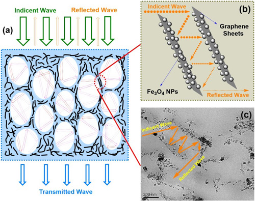 聚合物微发泡过程增加了材料的体积,降低了吸收剂的体积分数,这往往降低了聚合物微发泡电磁屏蔽/吸波材料的效能。为了进一步解决这个问题,研究人员在石墨烯表面原位合成了纳米四氧化三铁,利用上述复合纳米材料的电磁匹配,成功制备了电磁屏蔽性能更为优异的聚酰亚胺微发泡电磁屏蔽材料,比电磁屏蔽效能由36.4增加至41.5 dB/(g/cm3)。更为难得是,复合纳米材料的电磁性能匹配特点使聚合物微发泡材料更多的吸收而不是反射电磁波,这降低了电磁波对环境的二次污染( ACS Appl. Mater. Interfaces 2013, DOI: 10.1021/am4036527. )。