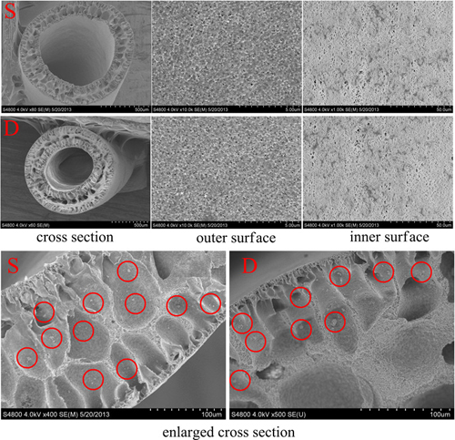 图1 单层(S)和双层(D)中空纤维膜的SEM