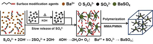 针对这一核心问题,5630福彩网生物医用高分子团队提出将表面改性和纳米粒子原位合成相结合的思想,通过采用双官能团小分子表面修饰剂,调控硫酸钡纳米粒子形貌,改善硫酸钡纳米粒子和高分子基质相容性,提高其和树脂基体的结合力。在此基础上,结合过硫酸根离子原位分解过程,实现表面改性硫酸钡粒子可控原位合成(图1,图2)。