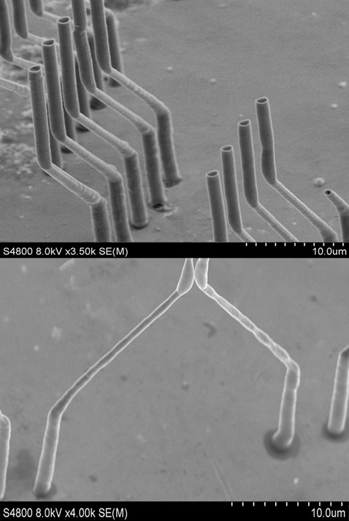 下图是研究过程中制备的一些微纳线阵列,微纳线直径可达到500nm以下,微纳线间距可小于500nm。目前研究团队采用的是单针‘直写’方式,通过程序控制,制备出预先设计好的各种直线、折线或曲线阵列,也可以采用类似3D打印技术的方式,制备出简单的3D微纳器件。目前三维微纳结构制备系统和制备技术正在进一步优化和完善当中。研究人员希望配合团队其他成员开展的3D打印材料和技术的研究,完成从小尺度的微纳结构器件到大尺寸3D产品开发的系统性工作。目前,研究人员正在通过这种微纳结构制造系统,开发微纳尺度3D打印喷头(喷嘴)的研制工作。该项研究工作的完成,将能够使3D打印技术的精度进一步提高。同时,研究团队正积极加强与国内外同行的交流合作,希望通过协同努力,加快微纳器件研究和应用推广的进程。