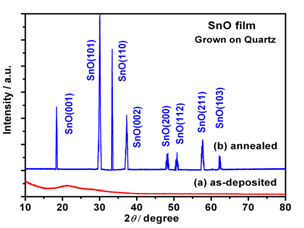 曹鸿涛课题组与美国密歇根大学潘晓晴教授课题组对SnO材料开展了合作研究,利用电子束蒸发技术在硅和蓝宝石衬底上制备出SnO薄膜,发现低温制备的SnO是非晶或者纳米晶,衬底温度为600 oC时,可以生长出外延或者具有织构取向的薄膜,通过电学测试,发现SnO薄膜的空穴浓度和迁移率分别在1017-1019 cm-3和0.1-2.6 cm2V-1s-1范围内,制备的薄膜样品的p型导电性可以长期稳定存在,研究结果在《应用物理快报》(Appl. Phys. Lett., 2010, 96, 042113)上发表。