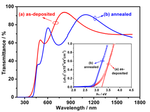 沉积态和退火态SnO薄膜X射线衍射图谱 沉积态和退火态SnO薄膜透射率光谱