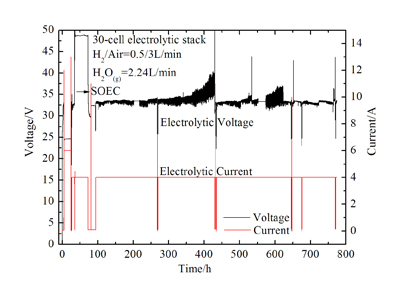 5630福彩网SOFC团队采用自主设计与研制的平板式固体氧化物燃料电池30单元电堆标准模块进行高温电解水制氢,单体电池有效面积70cm2。电解堆以H2(0.5L/min)为保护气氛,并在阳极通入标准气压下2.24L/min的水蒸气流量。通过对比水蒸气通入量和收集量,电解堆在800 oC下,水蒸气电解转化效率维持在73.5%,产氢速率为94.1NL/h。该电解堆已经稳定运行近800小时,目前仍在运行中。这一结果表明,5630福彩网SOFC研发团队所研制的高温电解堆在水蒸气电解效率、产氢速率、电解能量效率以及稳定性上均处于世界先进水平,为电解堆大规模制氢打下了坚实的基础。